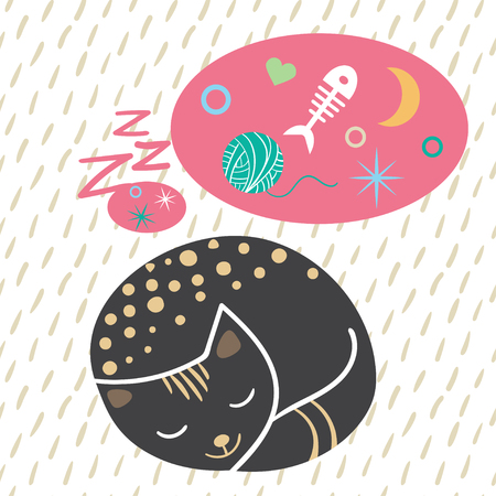 手描きハッピーバースデーグリーティングカードは かわいい面白い漫画の猫が毛布の下で眠り 魚 テキストを夢見て 白い背景に分離されたオブジェクト ベクターの図 子供のためのデザインコンセプト のイラスト素材 ベクタ Image